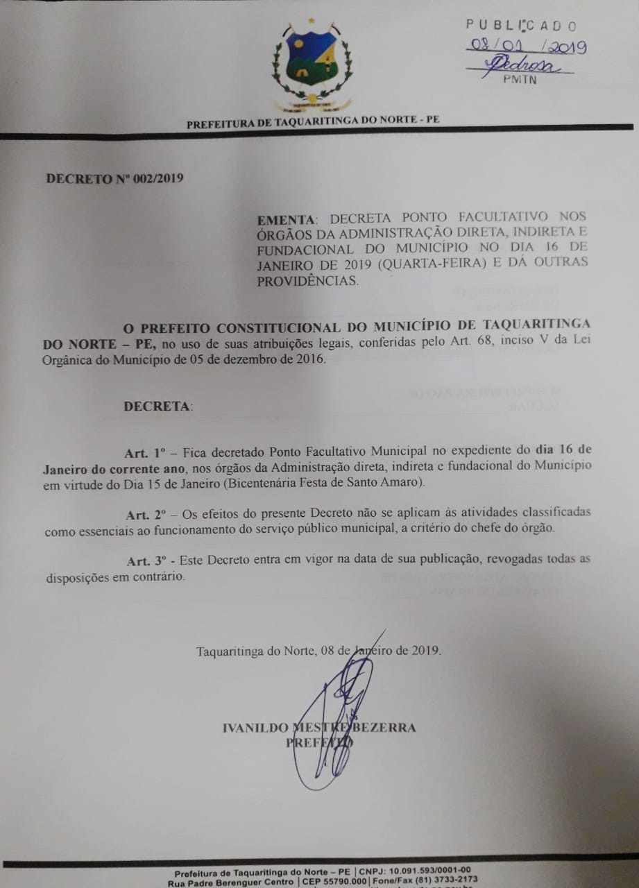 A Prefeitura Taquaritinga do Norte decreta ponto facultativo em seus setores, nesta quarta-feira, 16 de Janeiro, em razão dos festejos do padroeiro do Município, Santo Amaro.